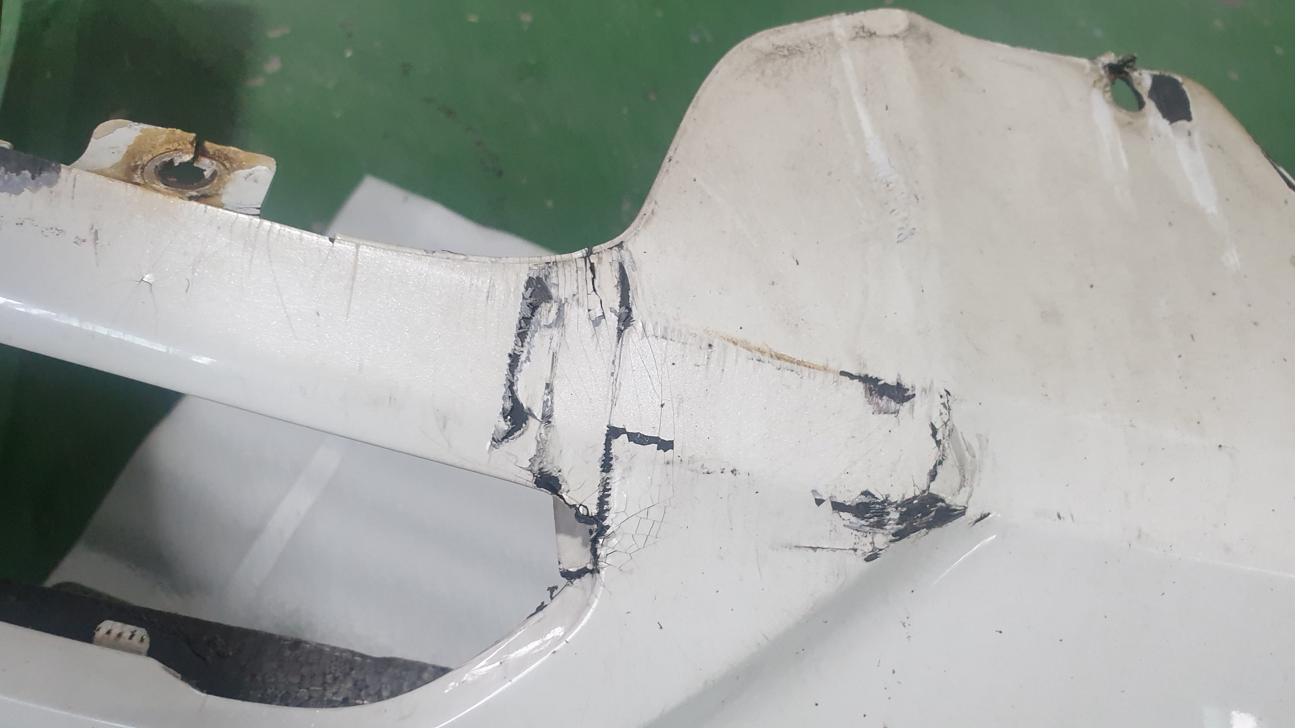 머플러팁이 범퍼에 고정되어 있는데 충격으로 고정부위가 휘었고, 범퍼는 찢어져 있습니다.
