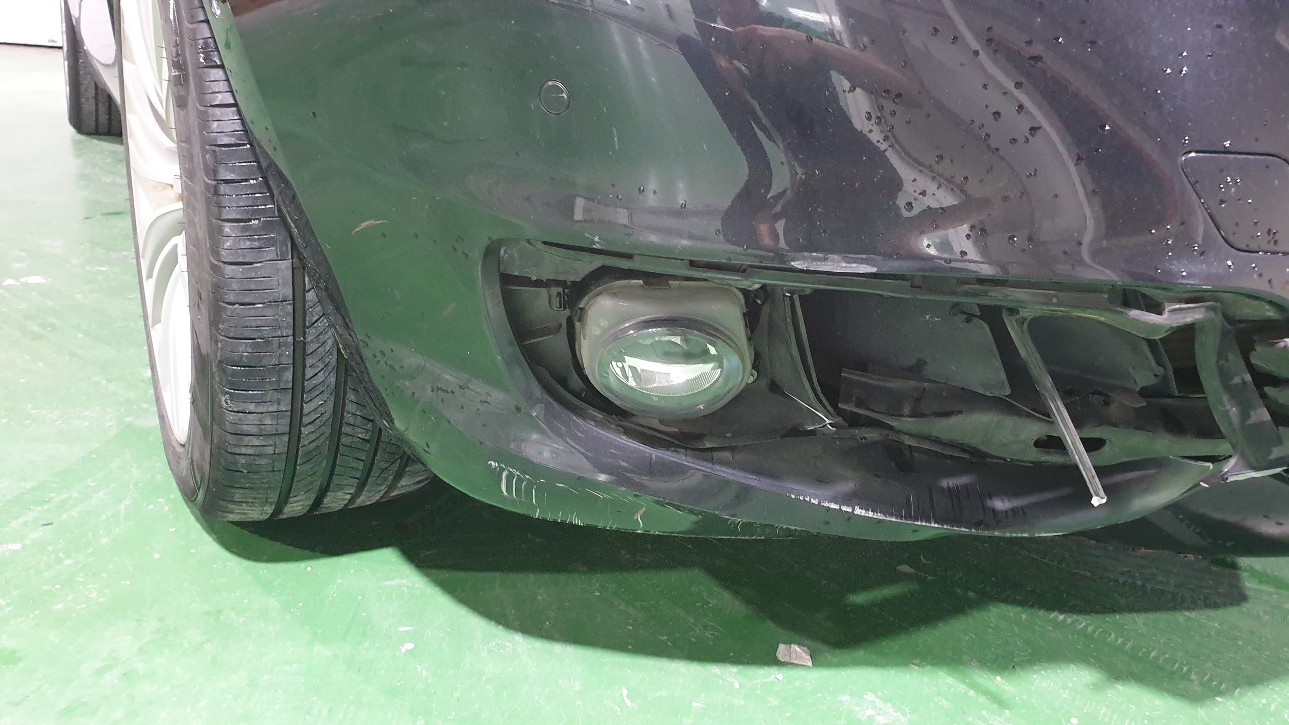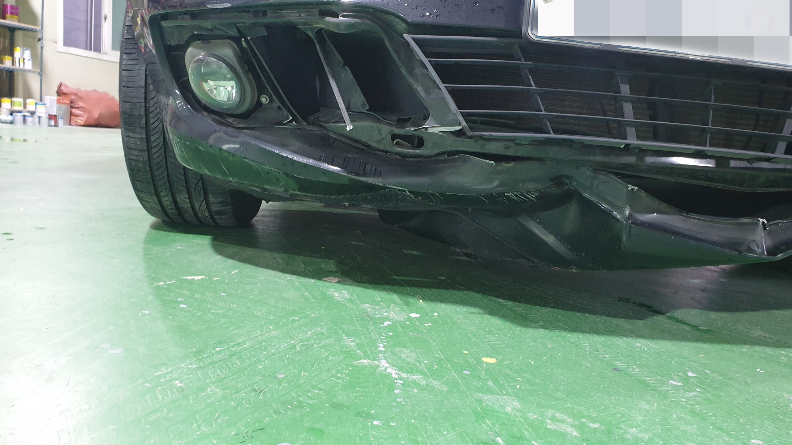 그 결과 범퍼 하단이 심하게 밀리면서 범퍼가 찢어지고 안개등 커버는 날아가고 그로 인해 조수석 쪽 앞 휀다도 약간의 대미지를 입게 되었습니다.