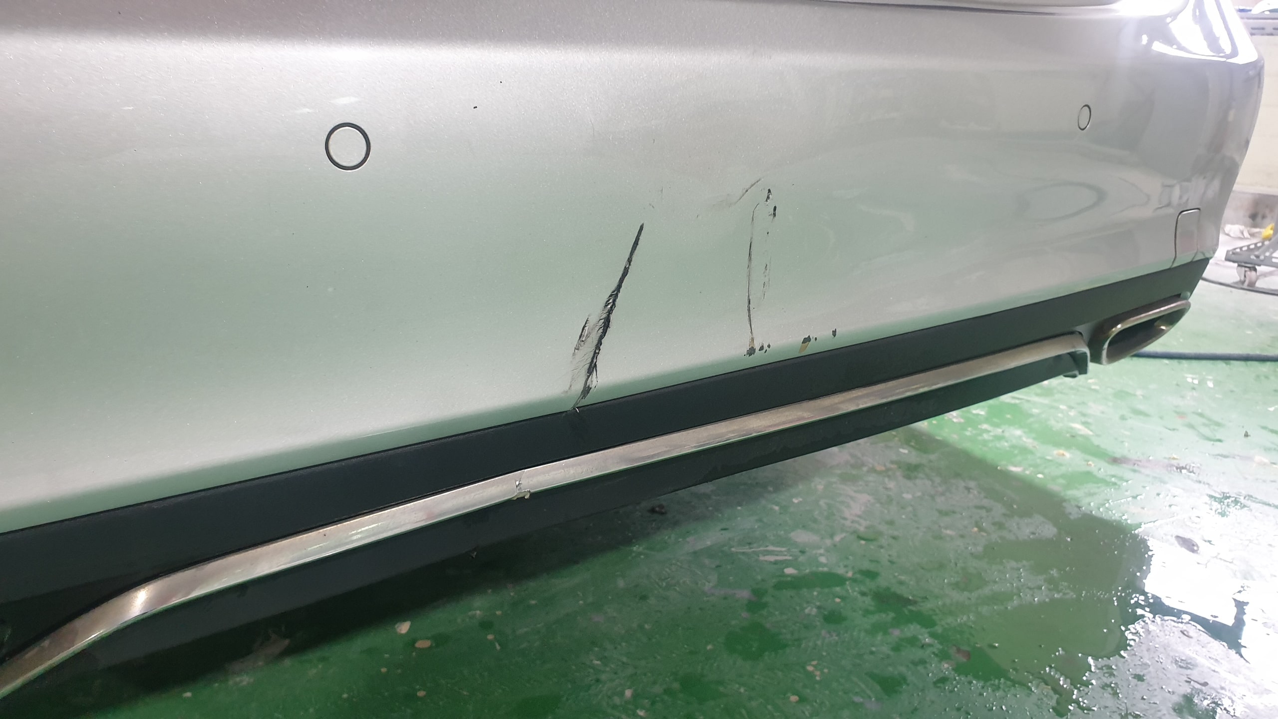 범퍼 옆면은 크롬 몰딩과 후방 센서도 같이 쓸렸습니다.