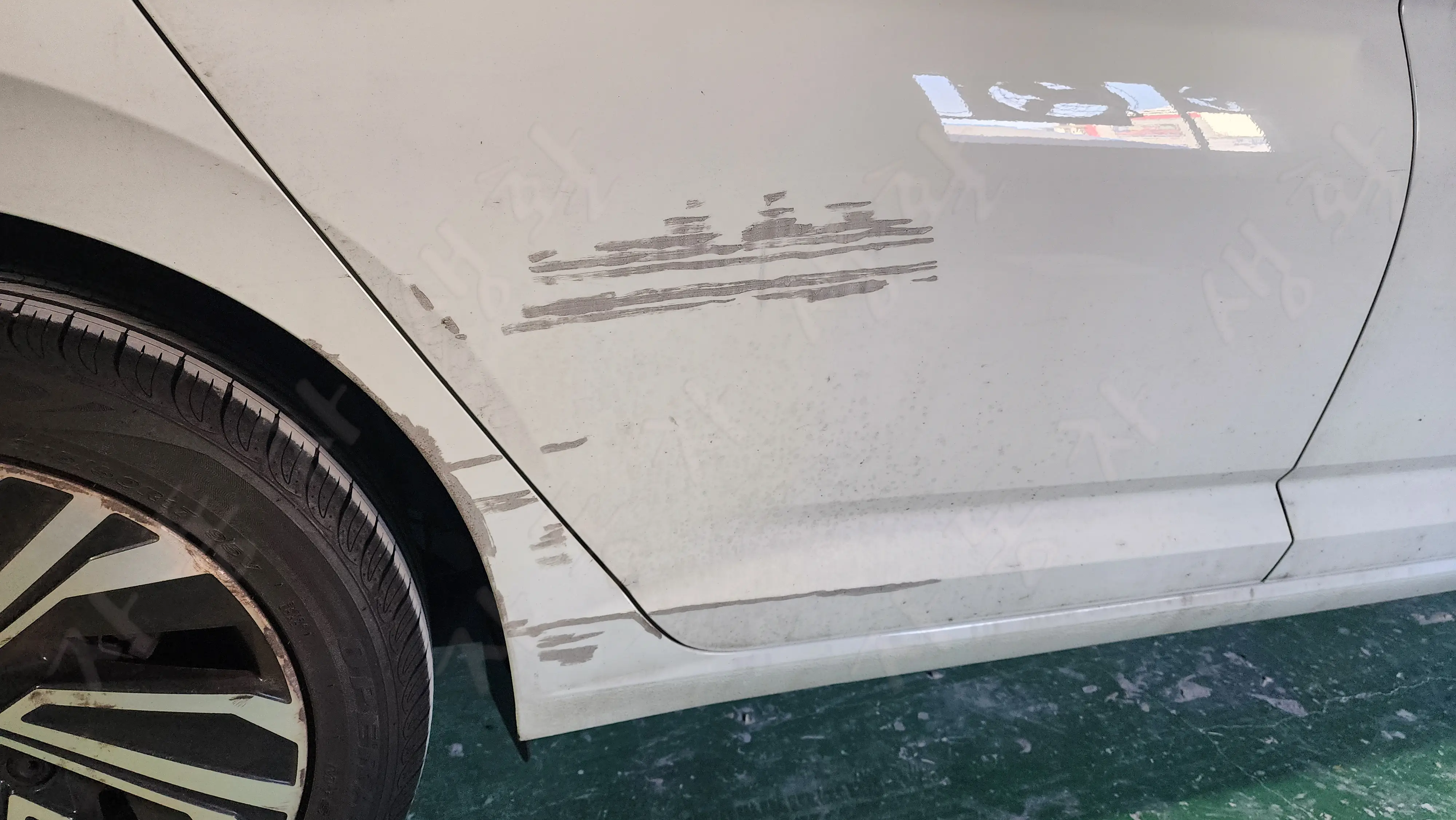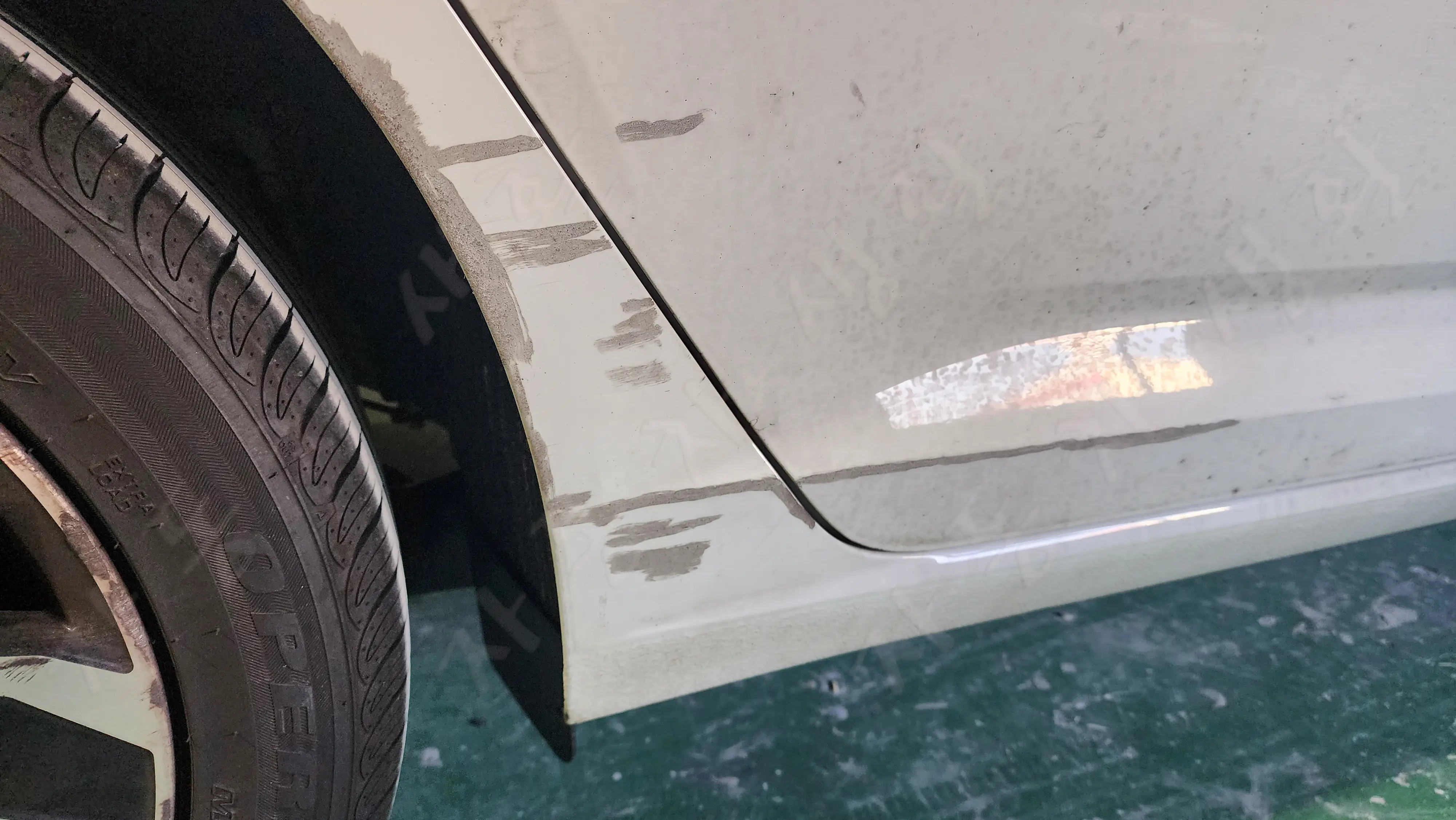 사고로 인해 손상된 부위는 조수석 뒷문과 뒤휀다로, 뒷문에는 길게 패인 자국이 있었습니다. 고객님께서 임시로 페인트를 덧발라 손상 부위를 보완하셨지만, 시간이 지나면서 페인트가 변색되고 더러워져 외관이 지저분해졌습니다.