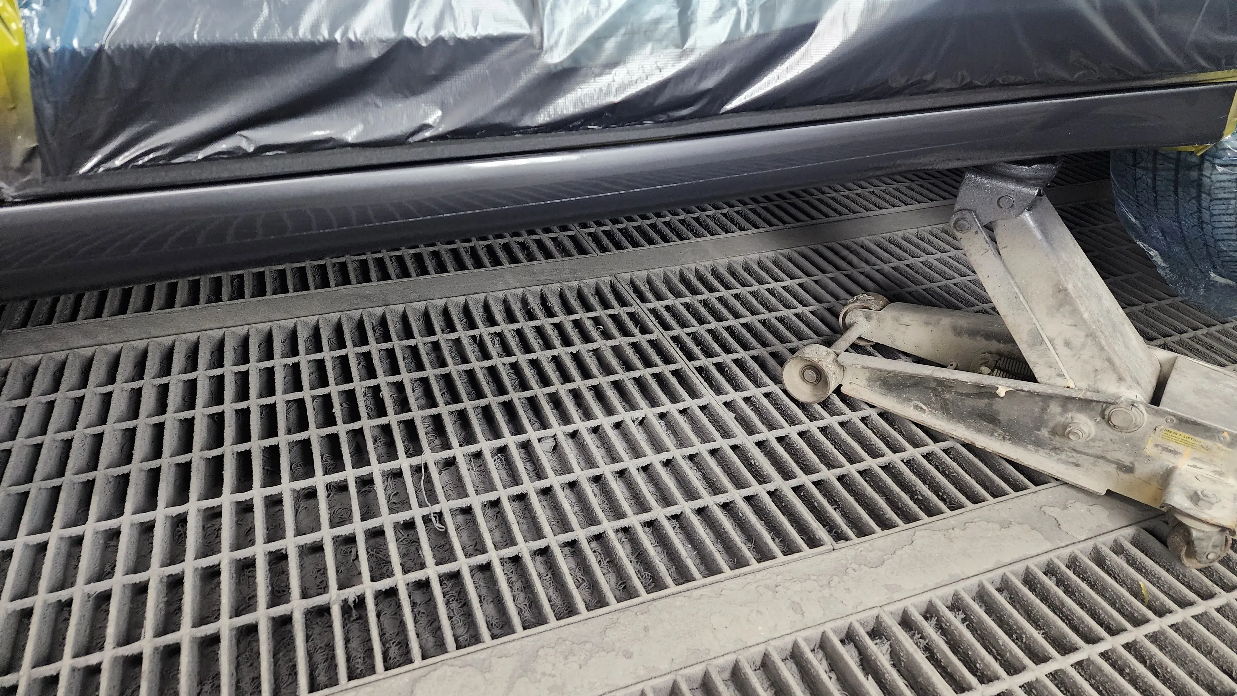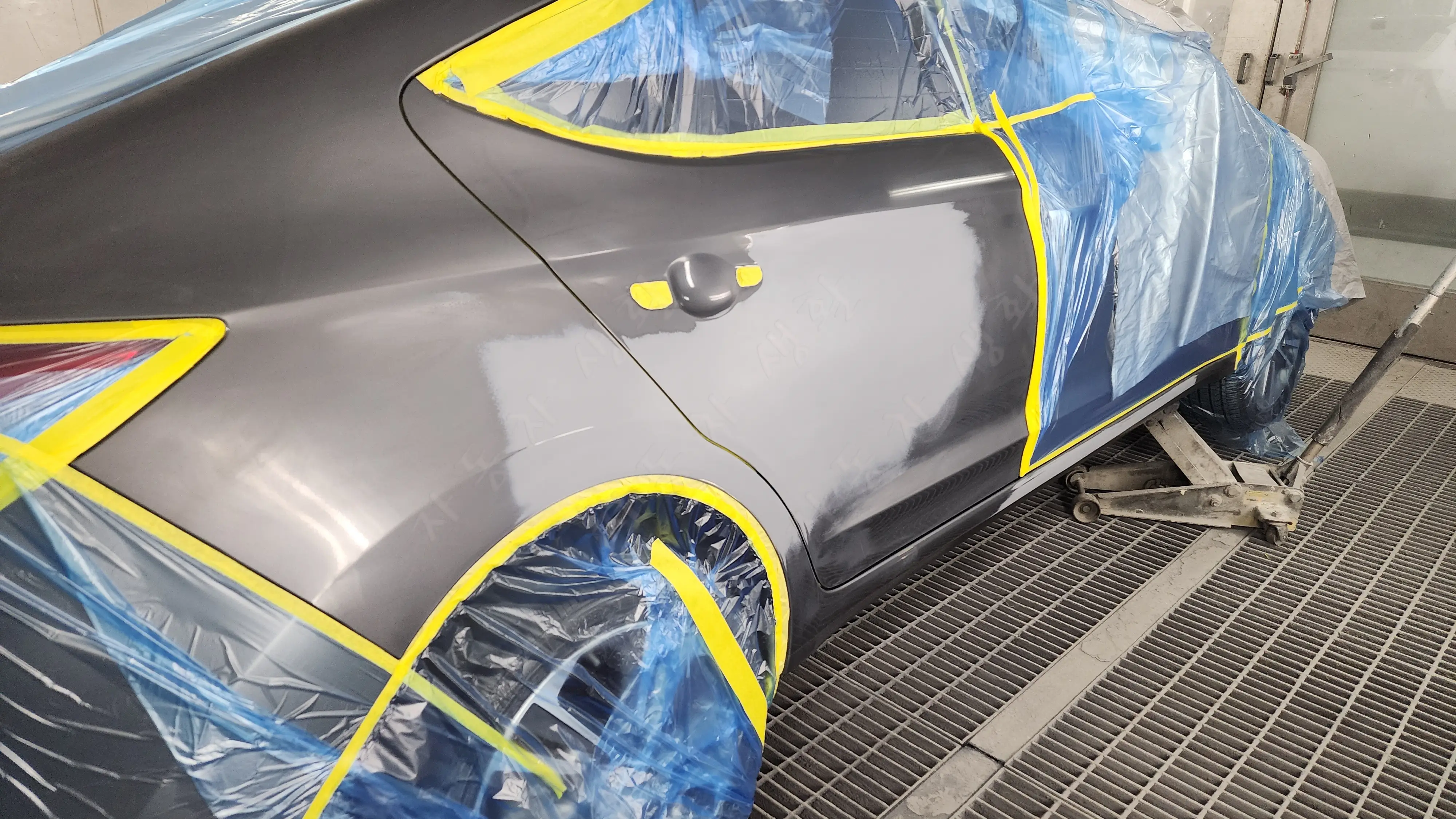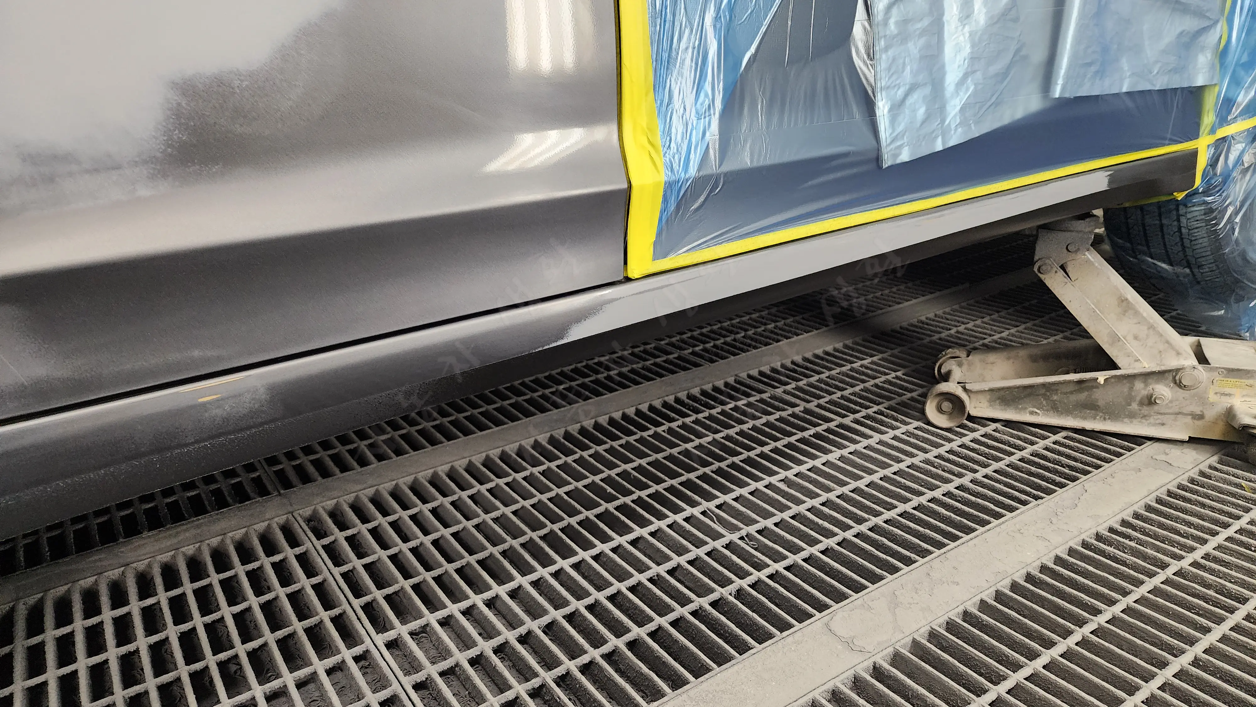판금 작업 후 서페이서를 도포하여 자잘한 사포 자국이나 홈을 메웠습니다. 서페이서는 베이스 도료의 부착률을 높여주는 역할을 합니다. 하단 스태프도 판금 작업이 끝난 후 서페이서를 도포하였으며, 서페이서가 완전히 건조된 후 언더코팅 라인에 맞추어 언더코팅 작업을 진행했습니다.