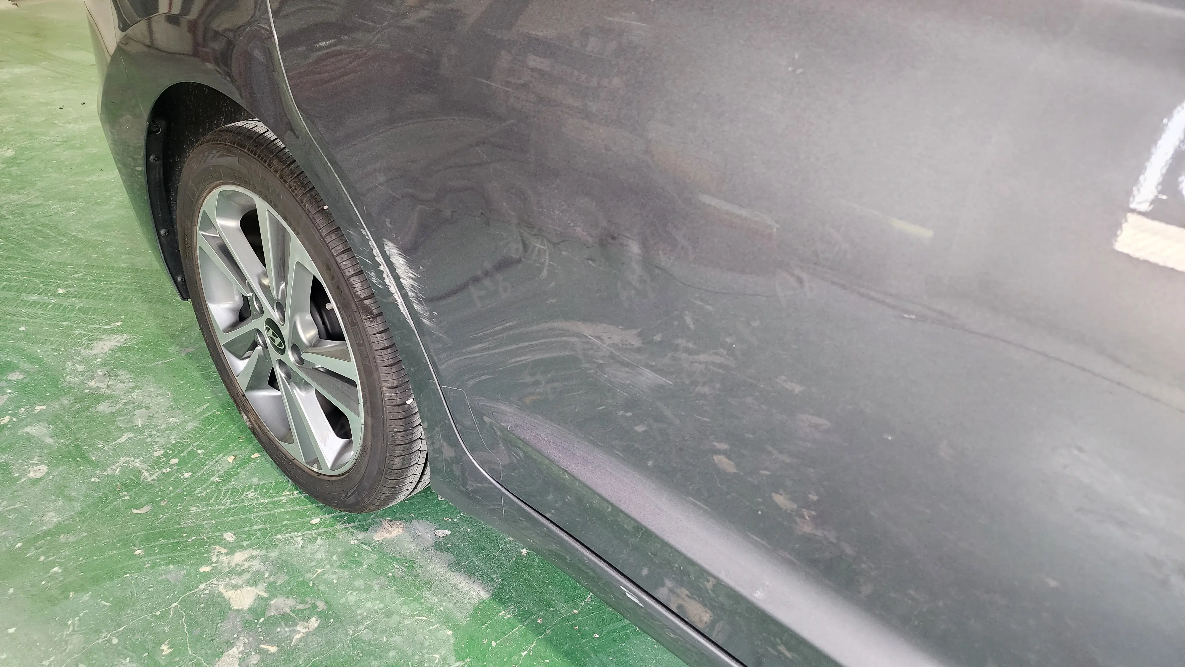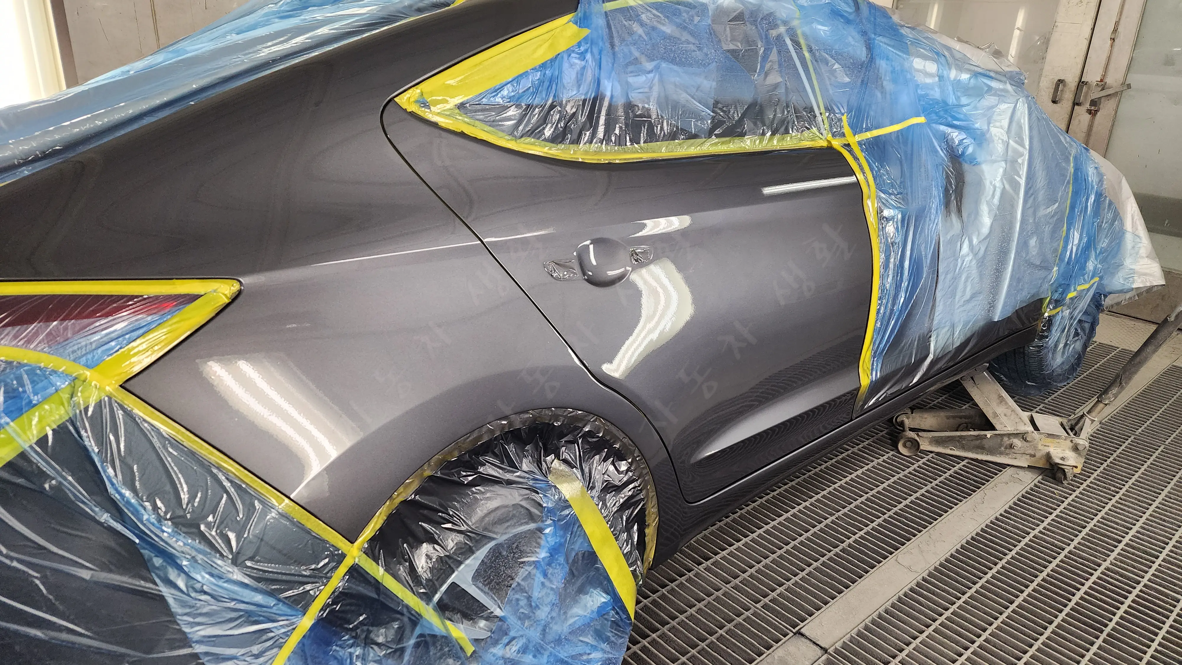 이번 작업 차량은 아반떼 AD 아이언 그레이(색상 코드: YT3)입니다. 사고 부위는 조수석 뒷문, 뒤휀다, 하단 스태프입니다. 주차장에서 좁은 곳을 돌아 나올 때 주로 발생하는 사고로, 문짝 끝부분이 쓸려 까지고 펜더가 움푹 들어갔습니다.