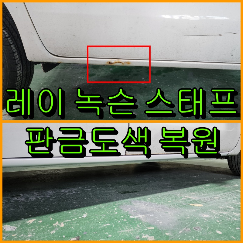기아 레이 클리어 화이트 차량의 조수석 하단 스태프 녹 제거와 복원 과정을 자세히 소개합니다. FRP 사용으로 장기간 보호와 함께 녹슨 부분을 효과적으로 복원하여 새 차 같은 외관을 되찾았습니다.