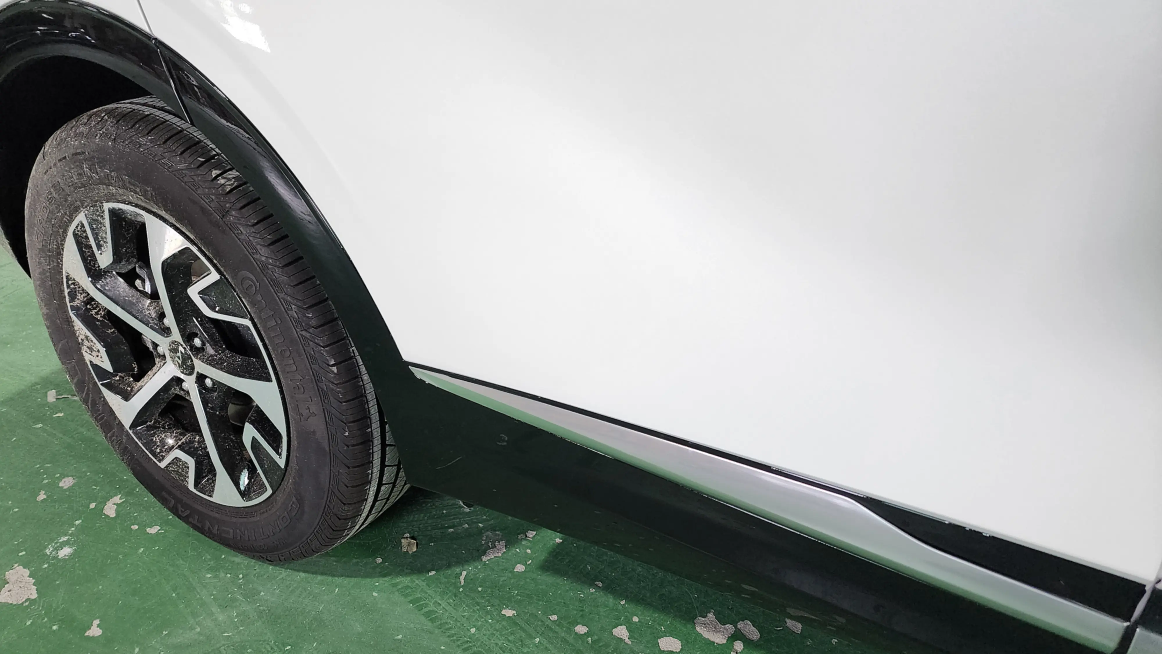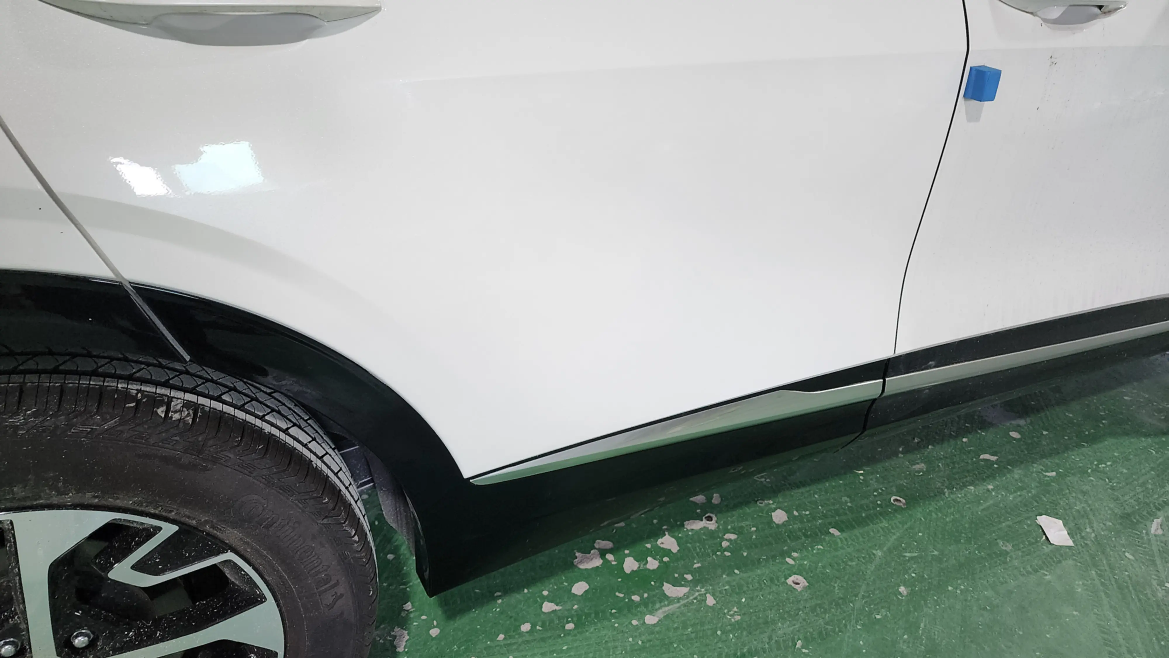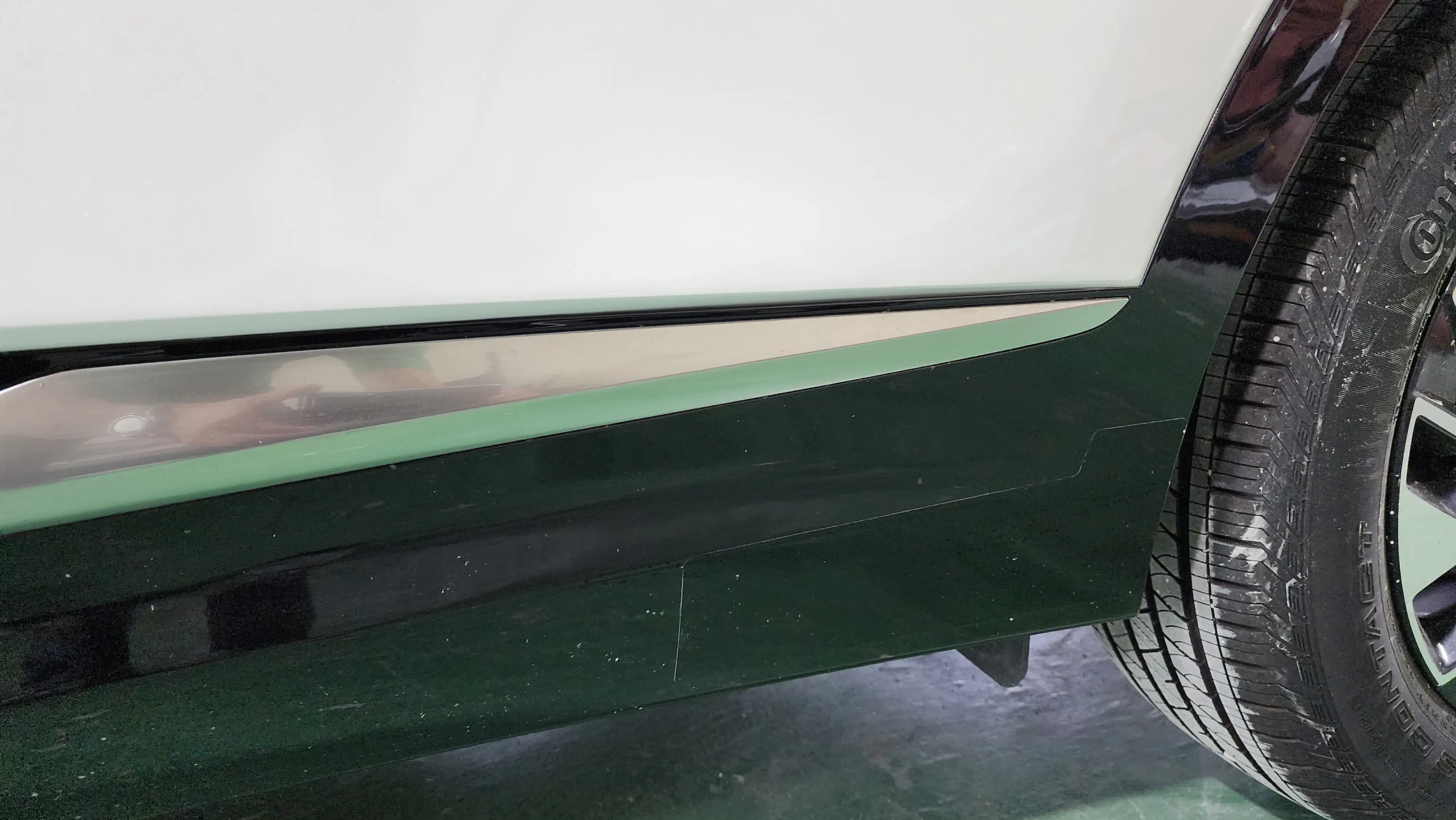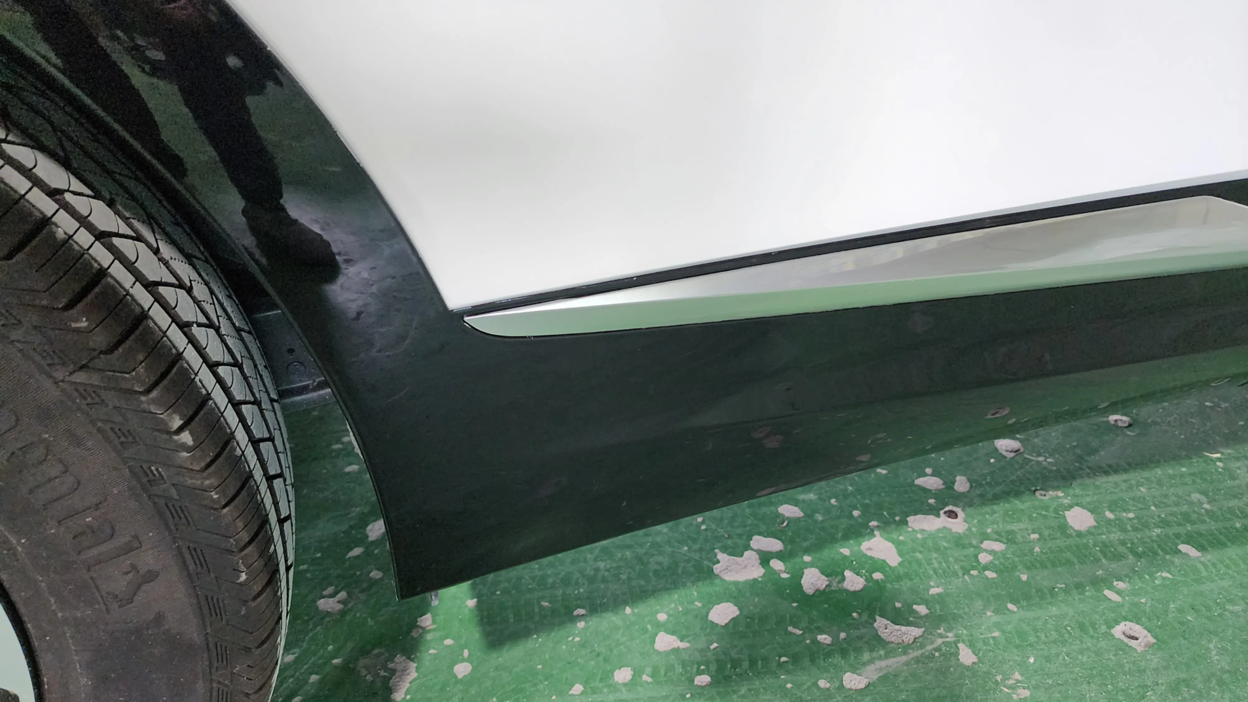 스노우 화이트 펄(SWP)이라는 밝은 펄 계열 색상을 가진 차량으로, 운전석과 조수석의 뒷문 하단에 눌림과 스크래치가 함께 발생한 상황이었습니다. 차량 하단에 위치한 블랙 가니쉬에도 손상이 있었고요.