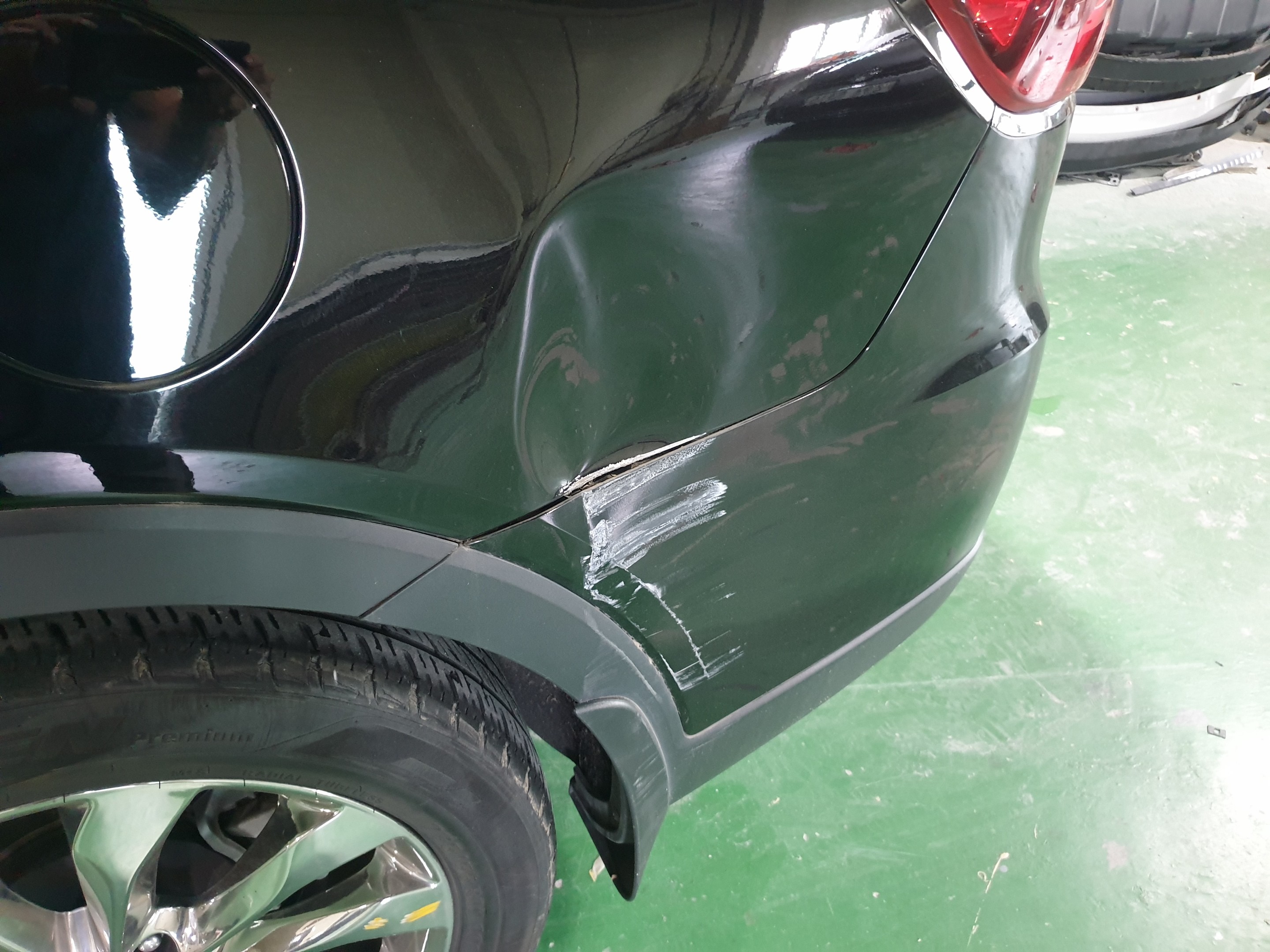 작업 부위는 운전석 뒤 휀다, 뒤 범퍼입니다. 후진 중 사고로 펜더가 심하게 찌그러지고 범퍼도 심하게 찍혔습니다.