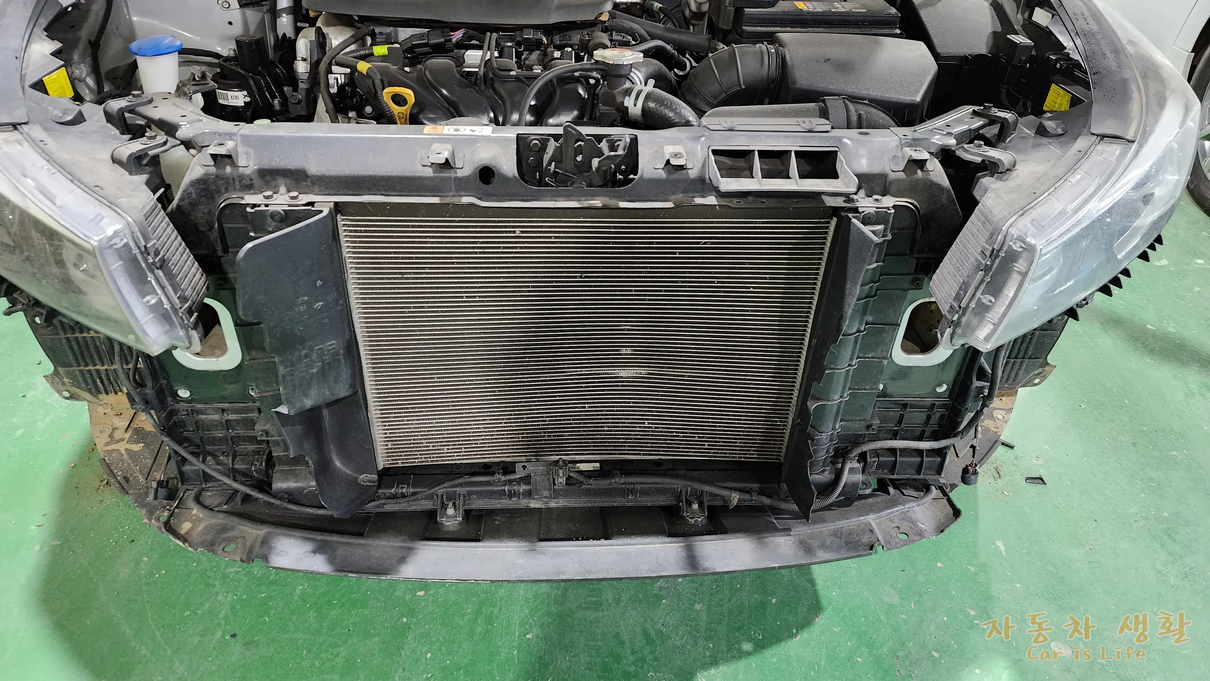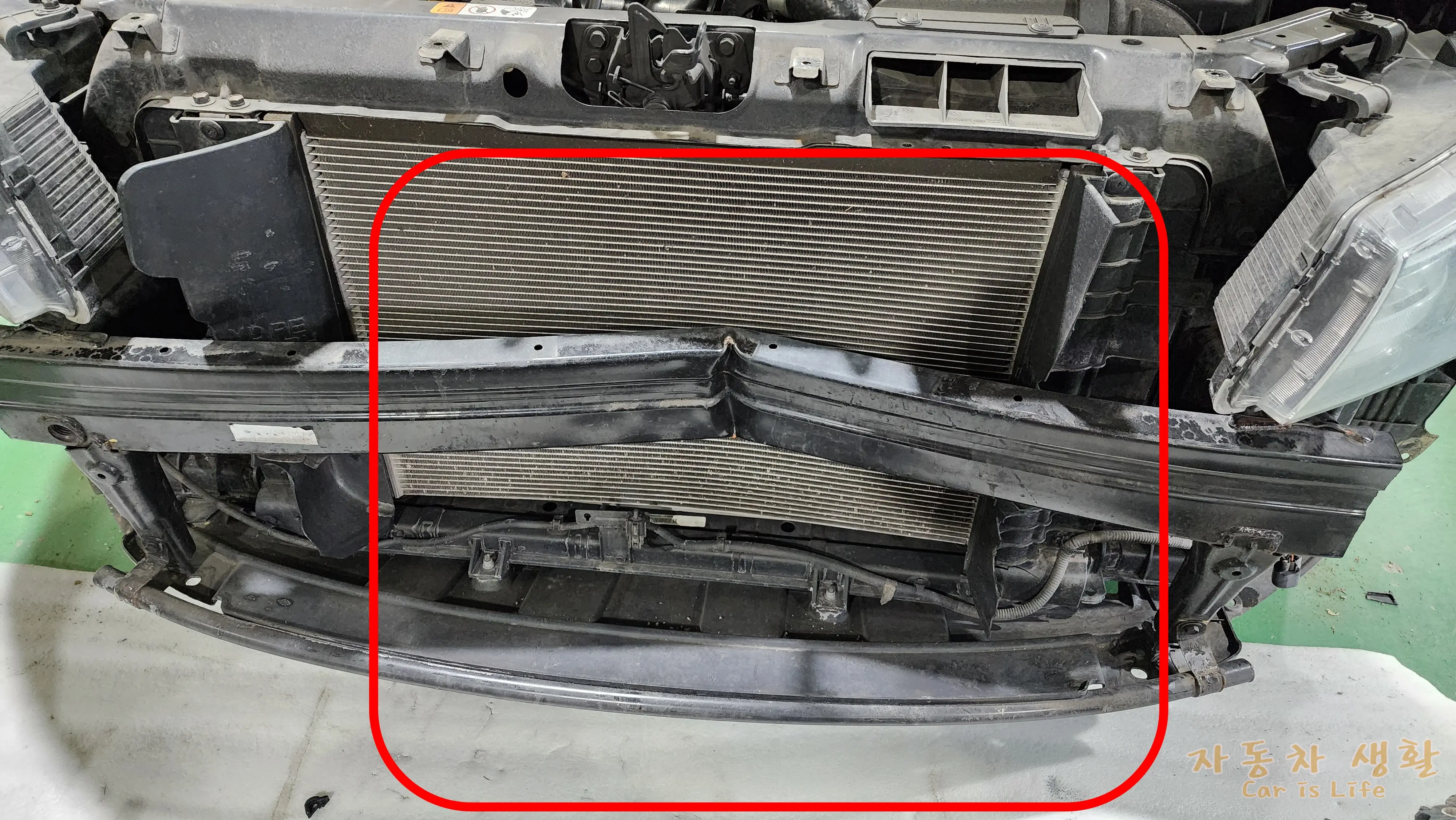 범퍼 레인을 탈거하였습니다. 단단한 범퍼 레일이 없이 바로 충격을 받는 다면 라디에이터는 물론 엔진까지 큰 충격을 받을 수 있습니다. 단돈 5만원으로 엄청난 수리비를 아끼게 되는 것입니다.