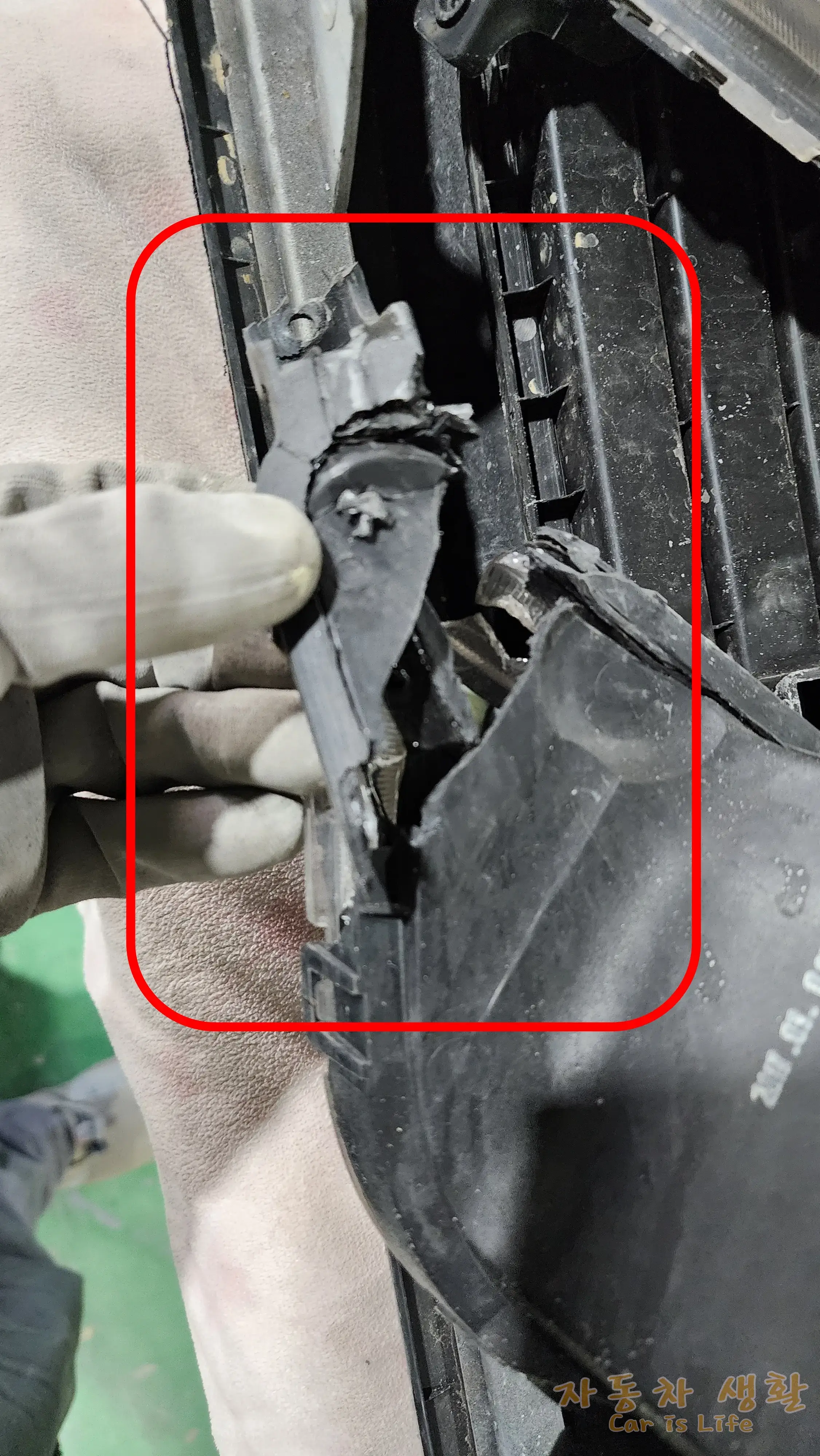 탈거한 안개등입니다. 양쪽 옆으로 있는 안개등인데 고정 부위가 다 깨져 버렸습니다. 역시나 상당한 충격을 예상할 수 있습니다.