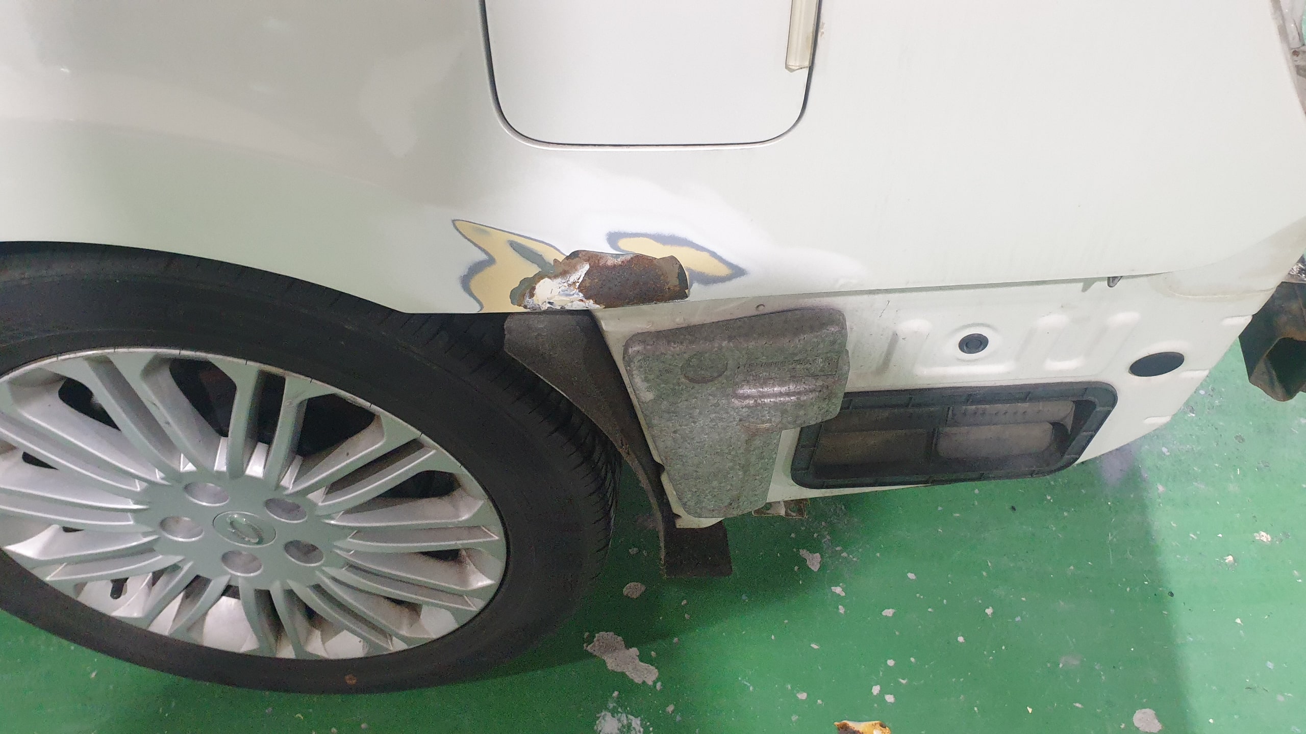 조수석 쪽 뒤 범퍼 머플러 부위의 범퍼가 찢어졌습니다.
