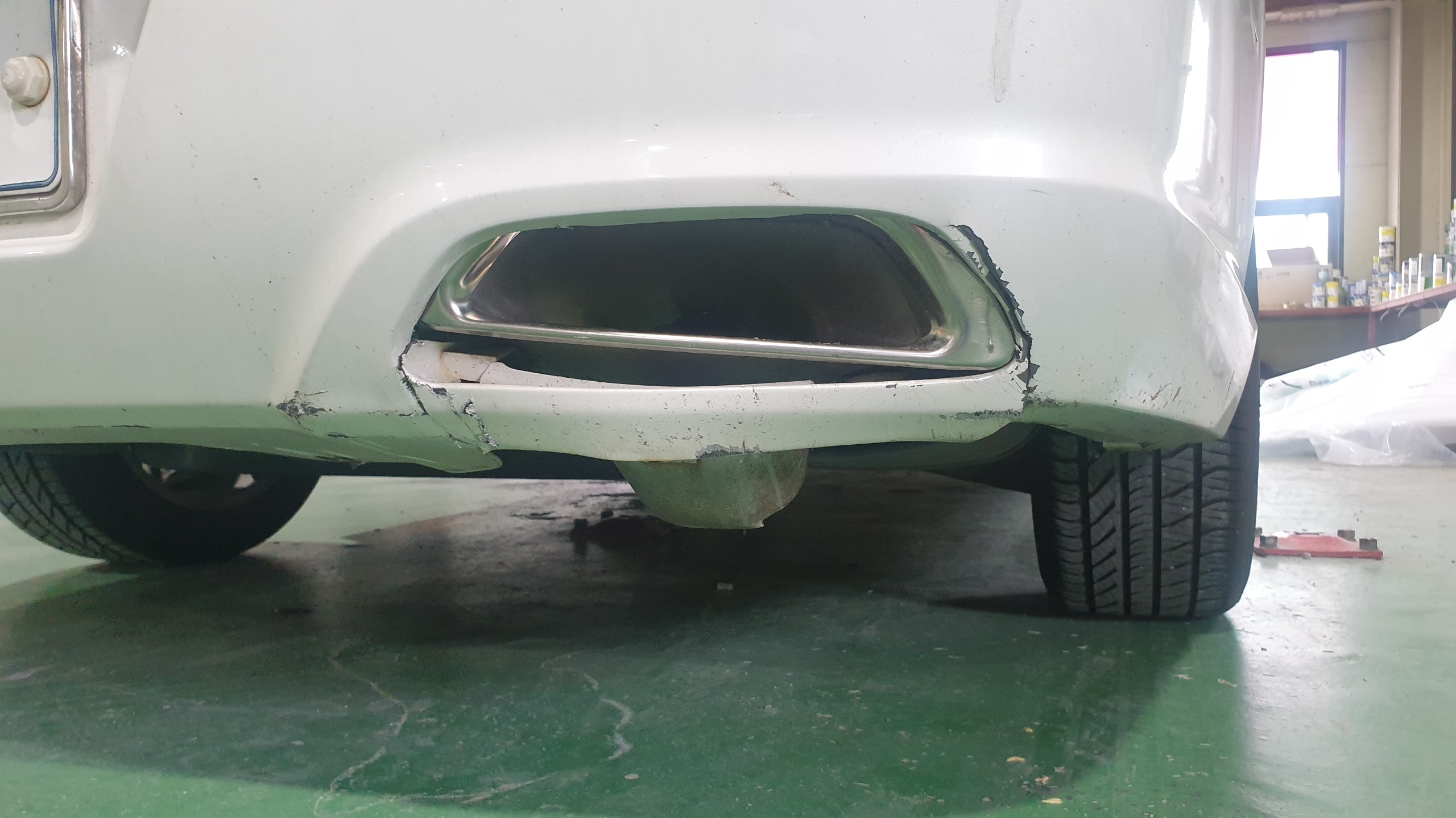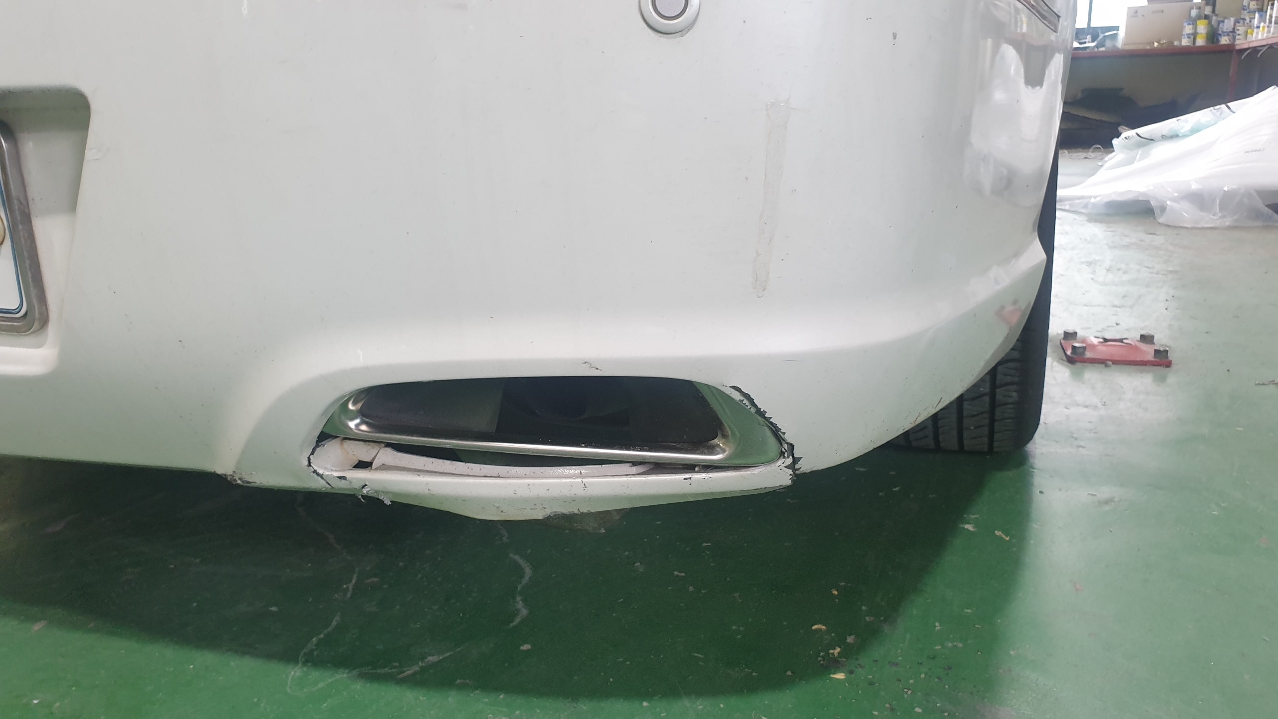 머플러팁이 범퍼에 고정되어 있는데 충격으로 고정부위가 휘었고, 범퍼는 찢어져 있습니다.