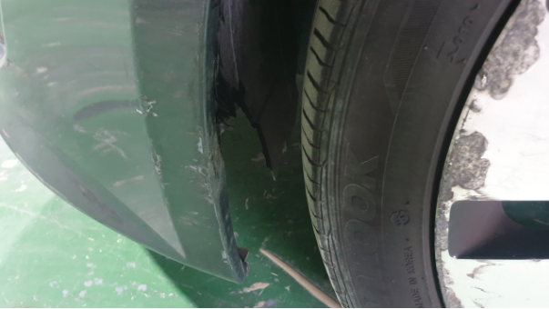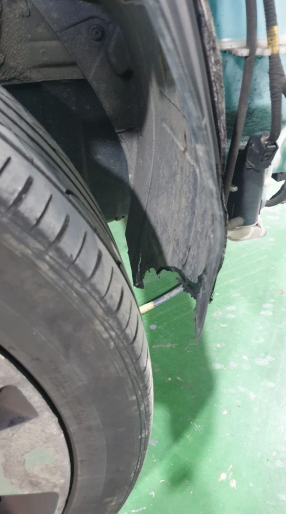 범퍼와 고정되어 있던 휠 가이드 부분이 떨어지면서 땅에 끌리다 찢겨 나간 것 같습니다.