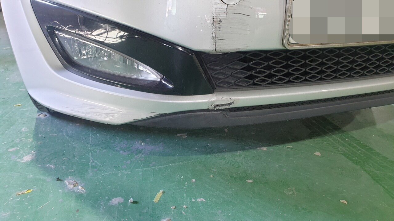 앞 범퍼는 기둥 같은 곳에 부딪친 것처럼 세로로 파손이 생겼습니다.